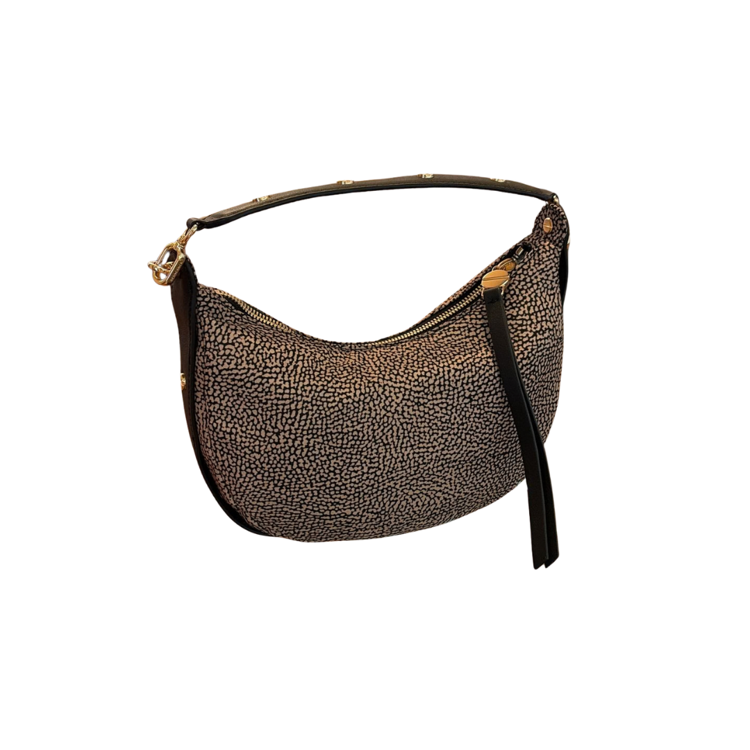 - Organizzazione: chiusura principale con zip, manico in pelle con elementi decorativi a vite.
