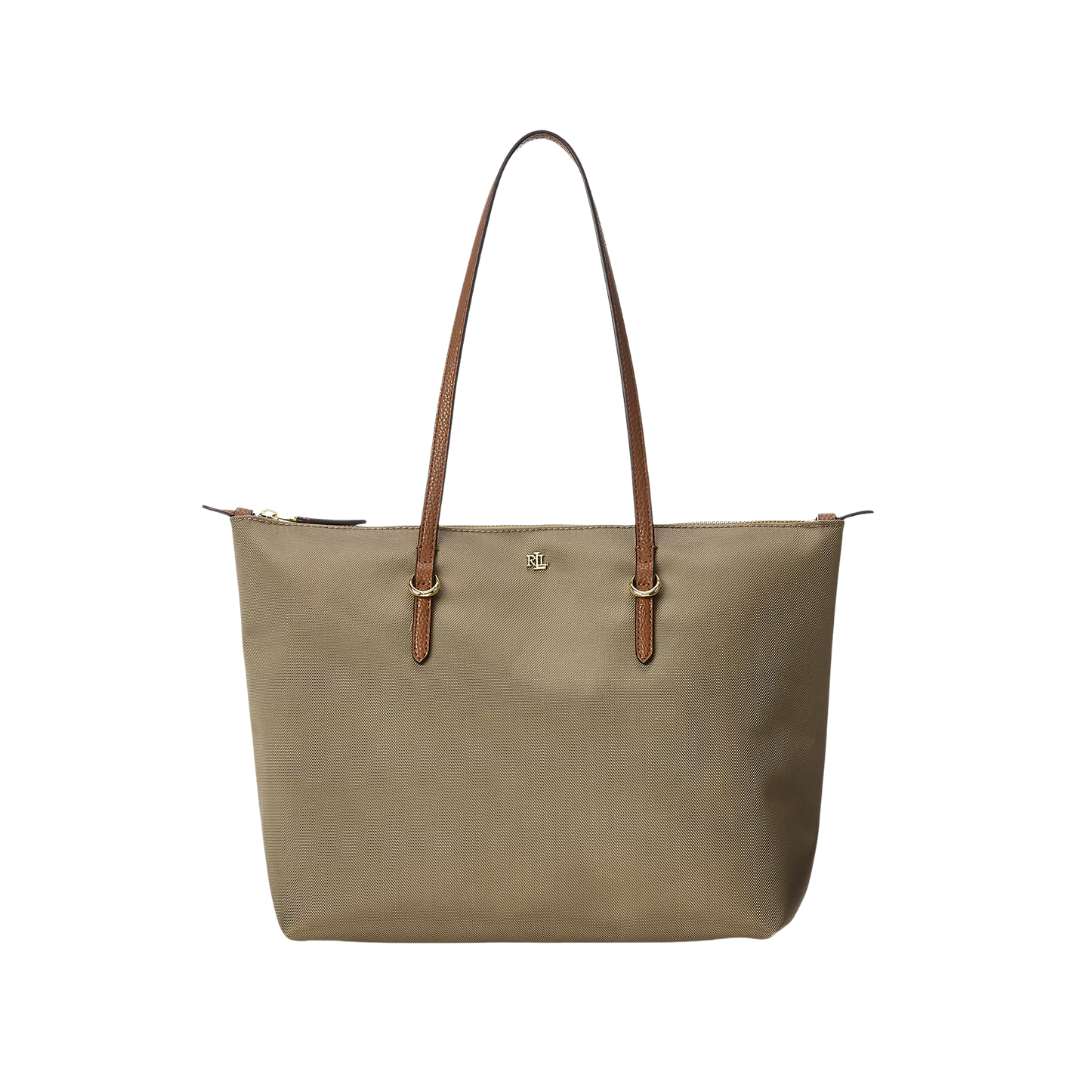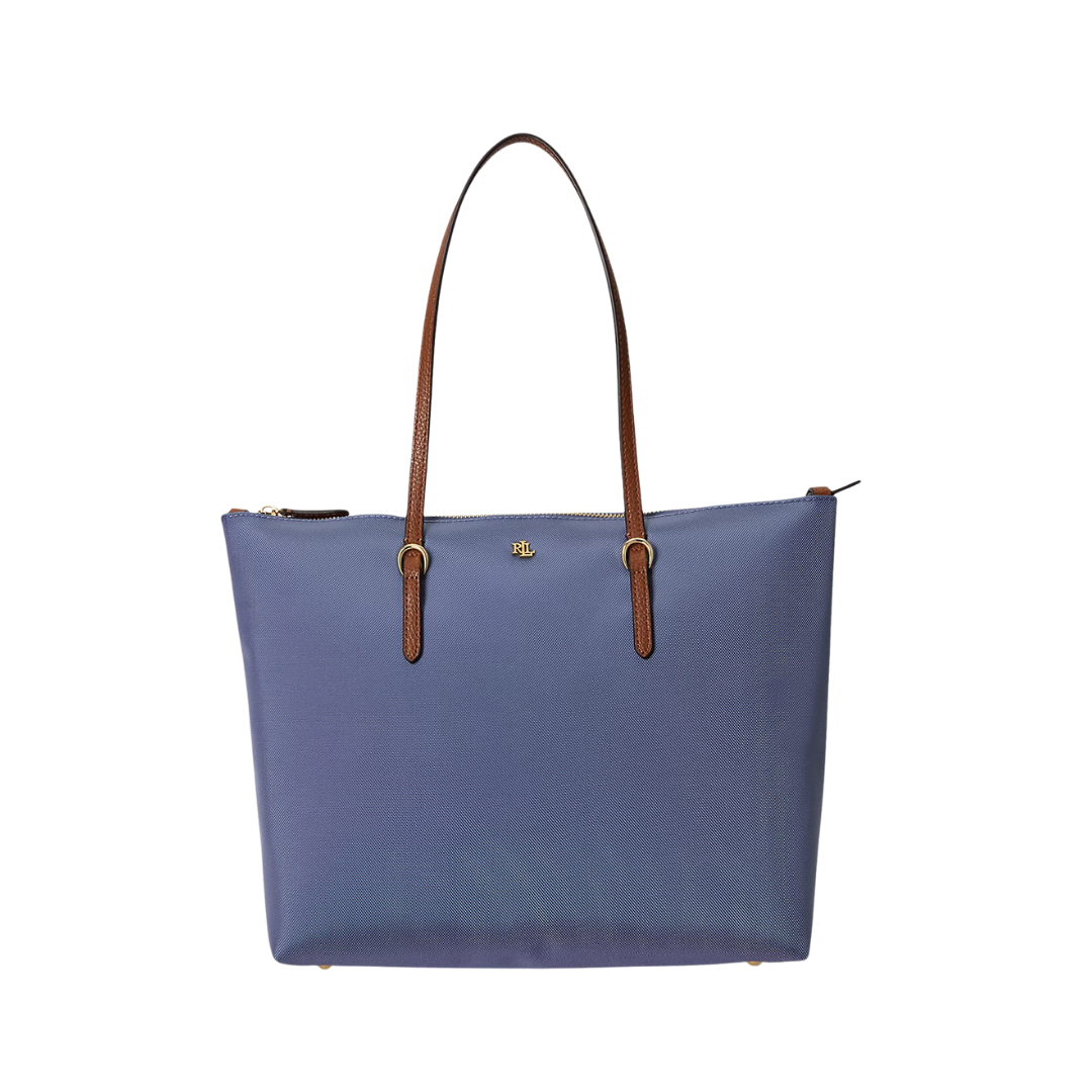 La Tote Keaton Media di Ralph Lauren è una borsa shopping donna costruita per la quotidianità: nylon resistente, manici in pelle ecologica, chiusura zip sul bordo superiore. La silhouette è ampia e strutturata, con piedini metallici sul fondo che la proteggono quando la appoggi. Il logo “LRL” dorato sul fronte è l’unico dettaglio decorativo — il resto è tutto funzione. Una borsa da lavoro e da vita di tutti i giorni che pesa meno di 300 grammi.