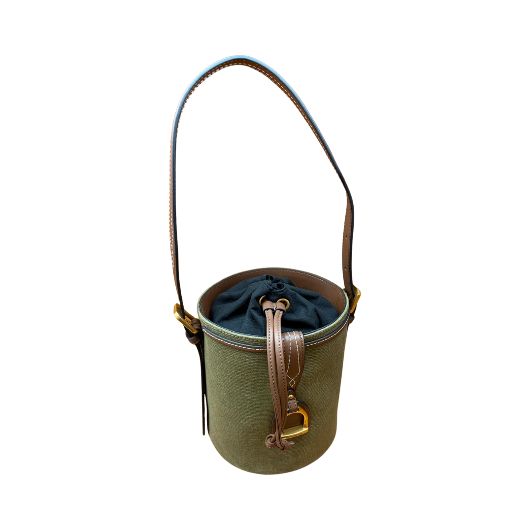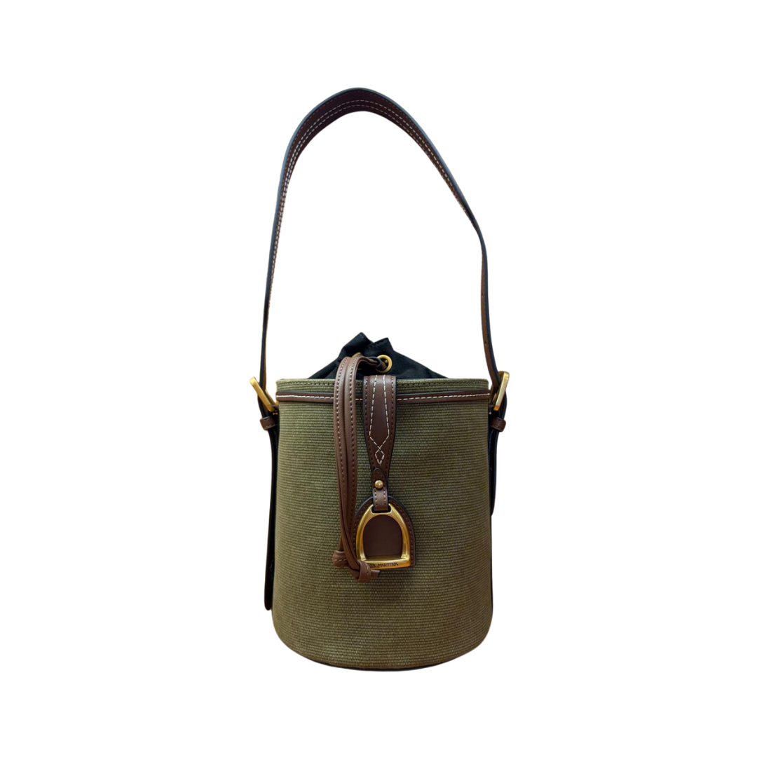 La Sierra Dreams Small Bucket di La Martina è una borsa a secchiello strutturata in canvas lavato — forma cilindrica, canvas verde oliva con quell’effetto vissuto che si ottiene solo con un trattamento specifico del tessuto. Sul fronte la striscia verticale in pelle sintetica con la maxi staffa logata dorata, che è il marchio di fabbrica del brand. Si chiude a cordini con sacca interna in tessuto. Una borsa secchiello donna compatta e riconoscibile, che porta con sé lo stile sportchic che da quarant’anni identifica La Martina.
